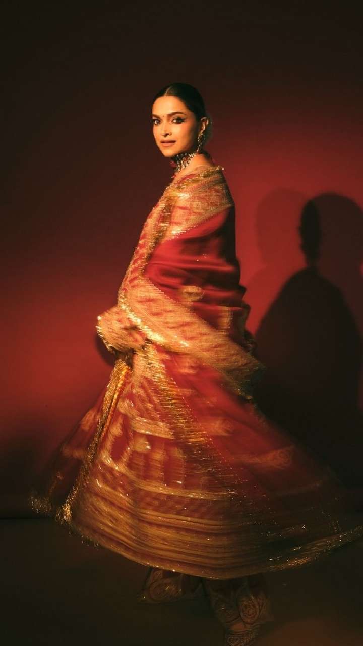 Deepika Padukone dazzled in a heavily embroidered three-piece red flared suit. She accessorised the look with traditional Jewellery and a serene gajra.