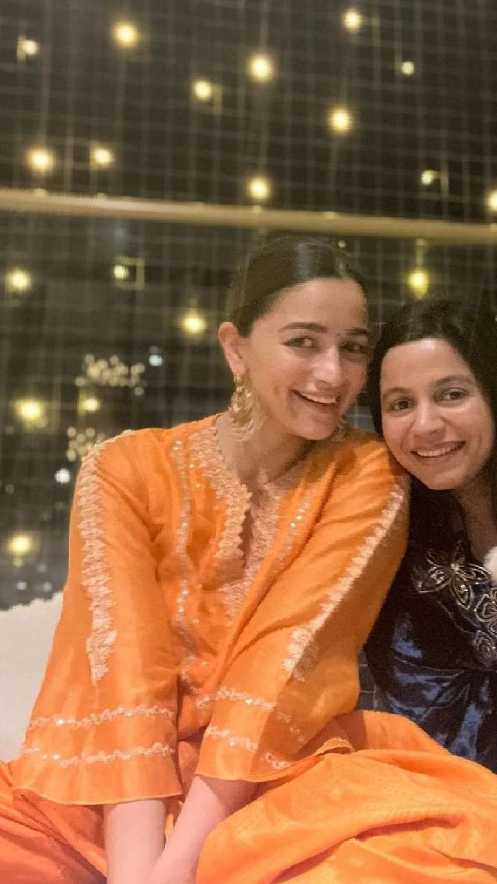 Alia Bhatt giggled in a golden zari-work embroidered orange silk palazzo suit set. She tied her mane in a sleek bun to complement the crepe-cut neckline of her suit.