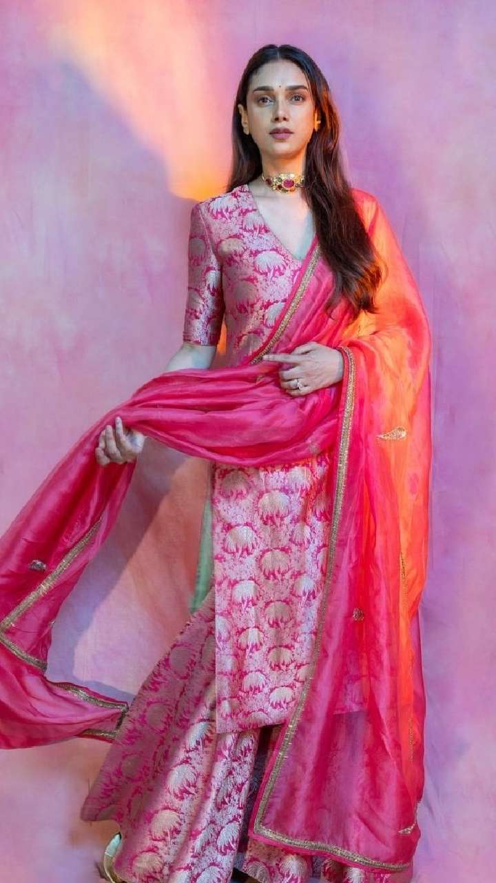 Aditi stole the spotlight in a vibrant pink silk sharara suit paired with a tissue dupatta. She elevated the look with matching choker and elegant juttis.