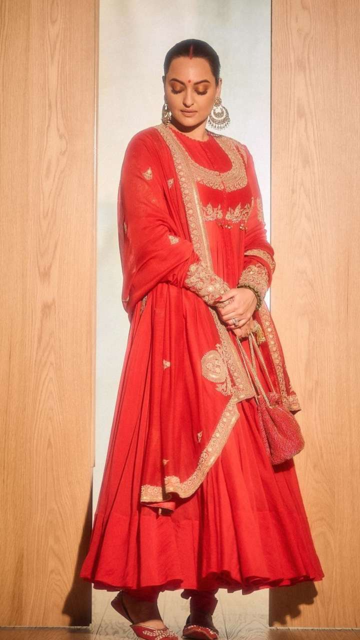 Sonakshi Sinha looked like a vision in a red angrakha-style anarkali suit teamed with a churidaar salwar and a matching dupatta.