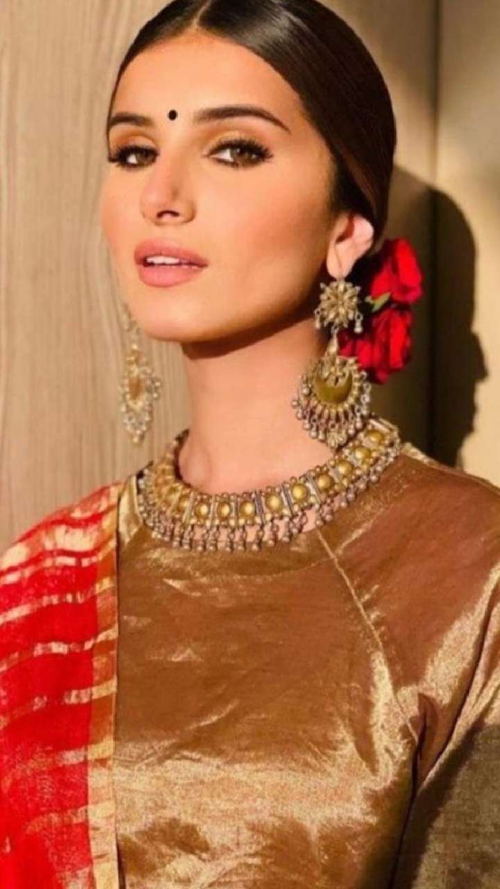 Tara Sutaria embraced timeless elegance in an embroidered-neckline metallic golden suit teamed with a traditional red dupatta. She glammed up her look with a rose adorned bun.